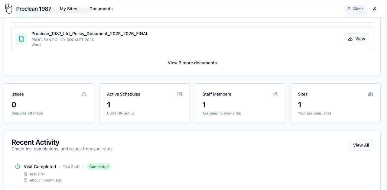 Access your secure dashboard 24/7 to download cleaning schedules, specifications, and compliance reports—ready for any CQC inspection.